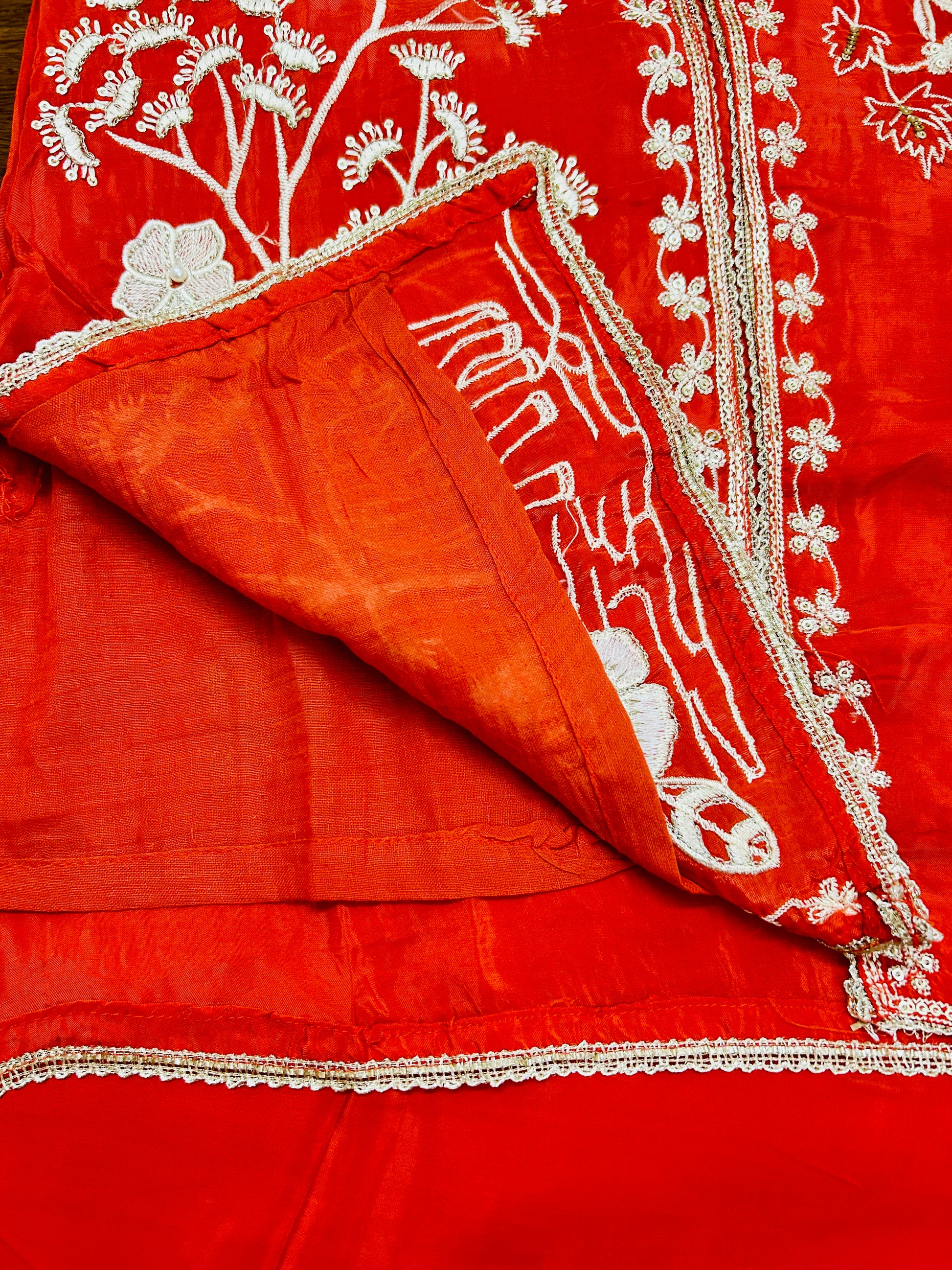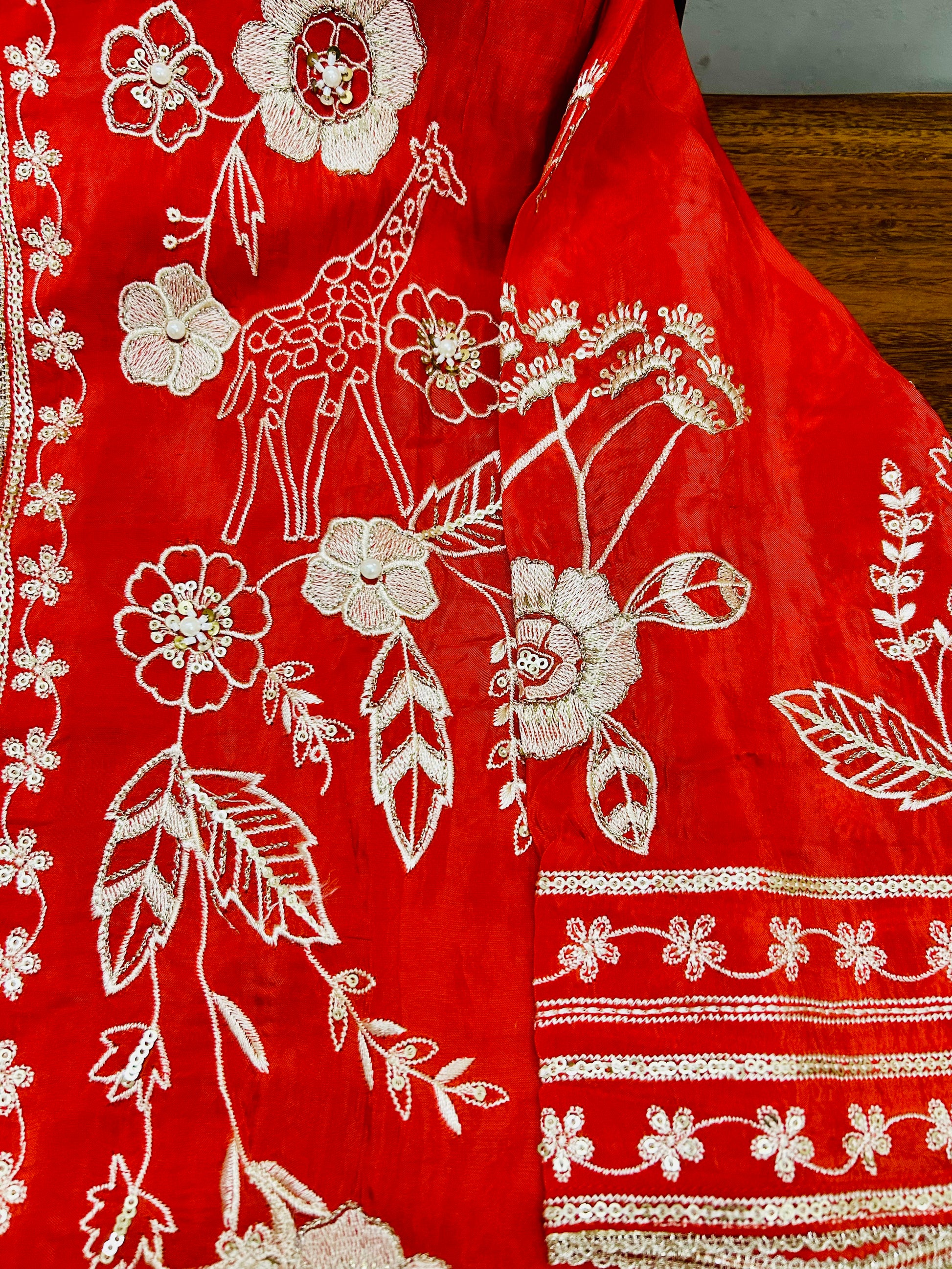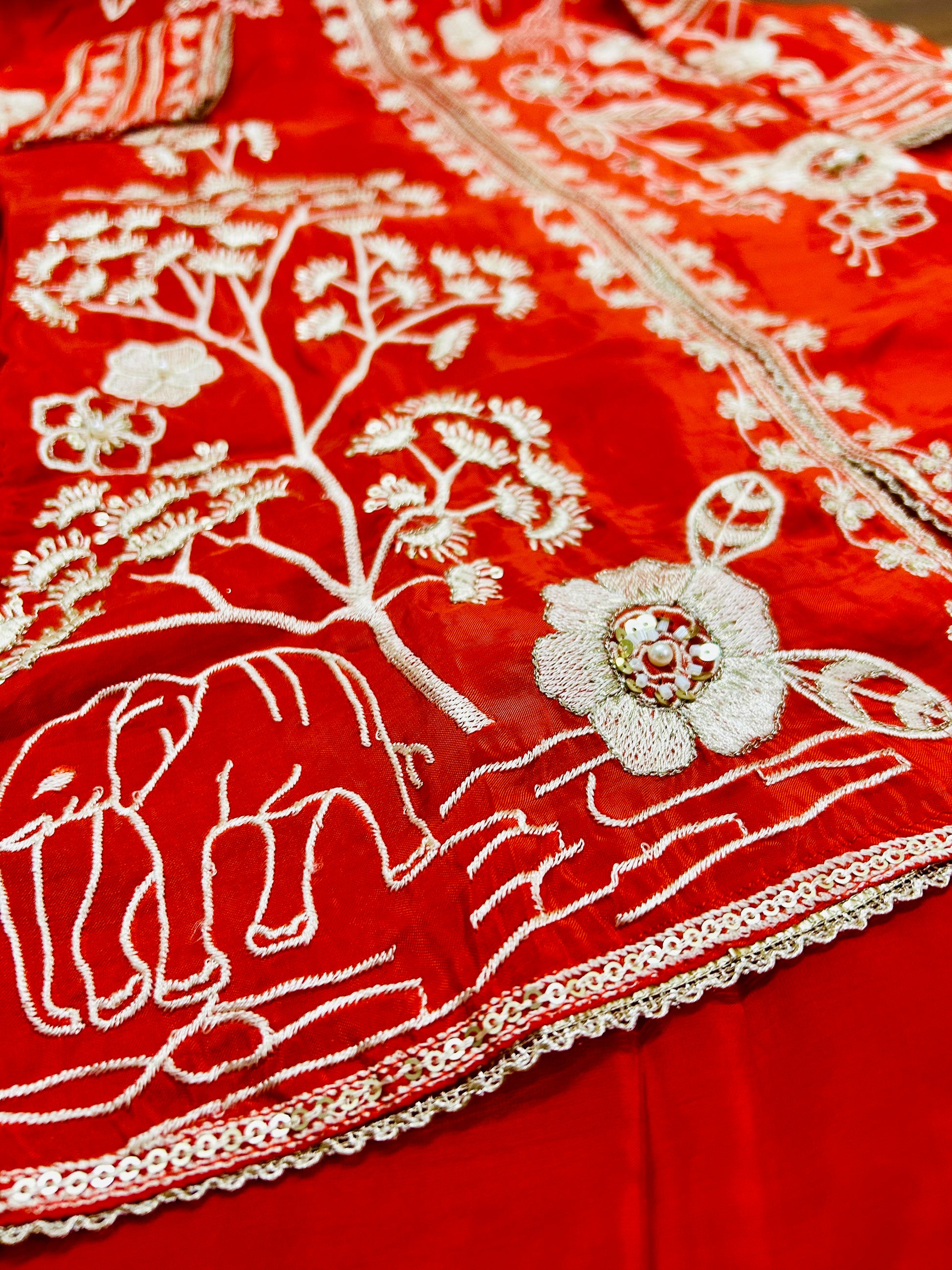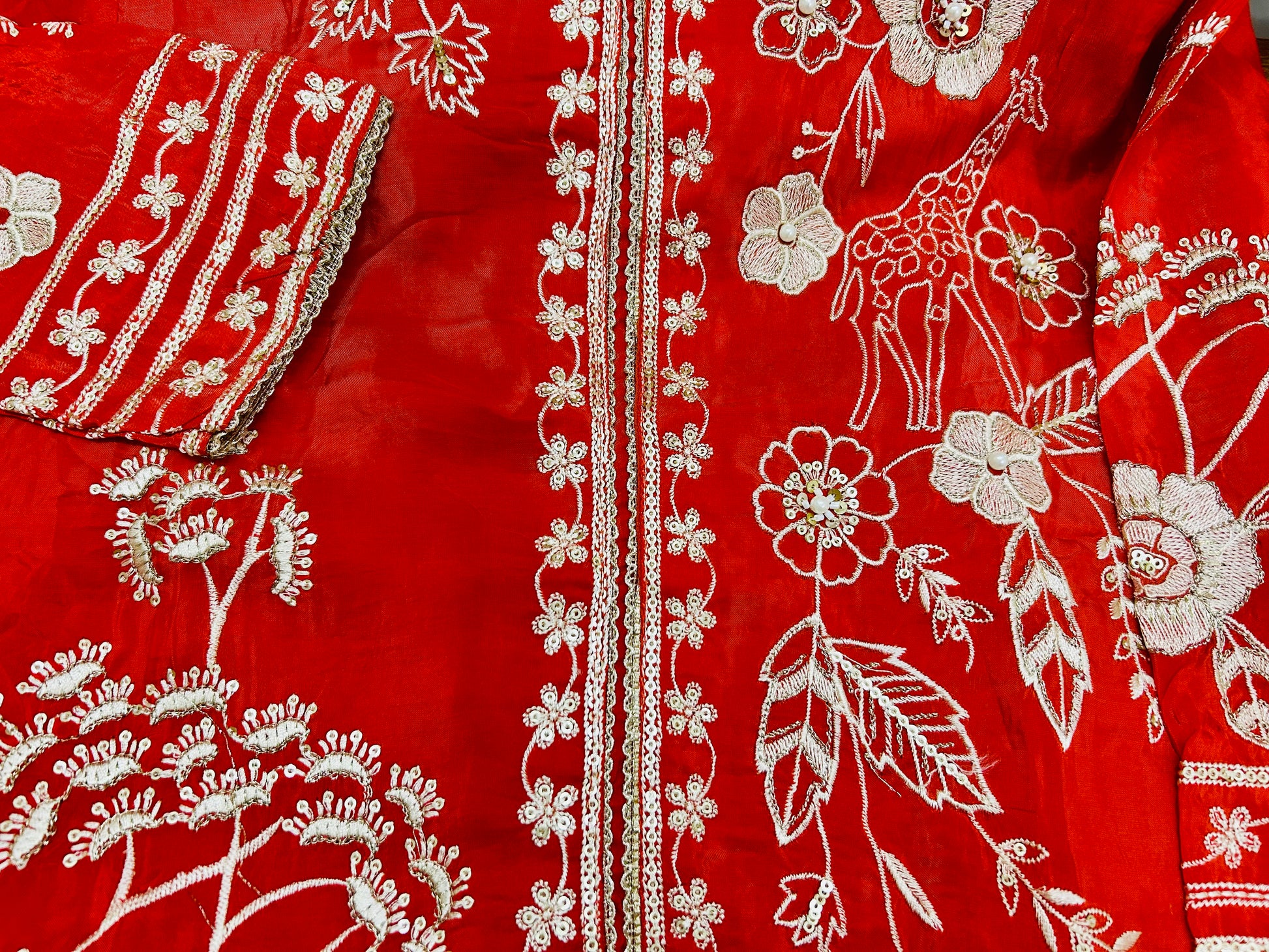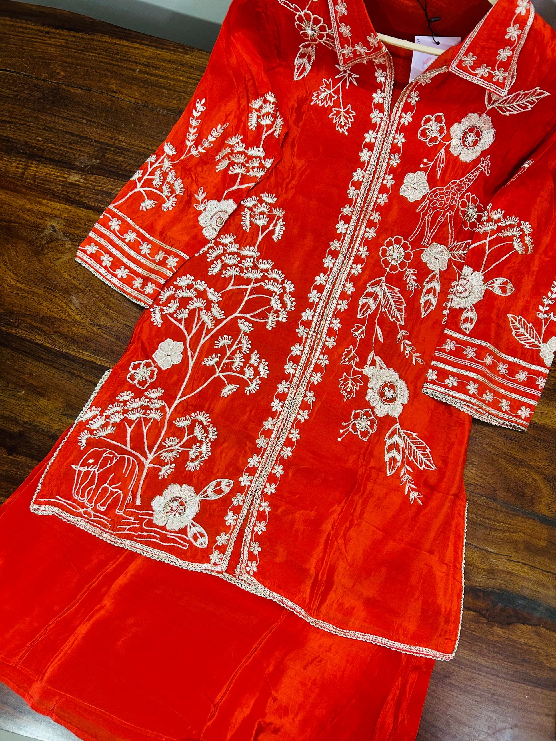 Highlights: High-density white Thread Embroidery featuring Nature and Wildlife. Katdana, sequina nd pearl handwork woven with white embroidery threads. Artisanal work creates a unique jungle scene across the garment. The shirt-style collar and sleeve cuffs are detailed with matching white embroidery bands and metallic borders. Mul cotton lining inside the kurta.