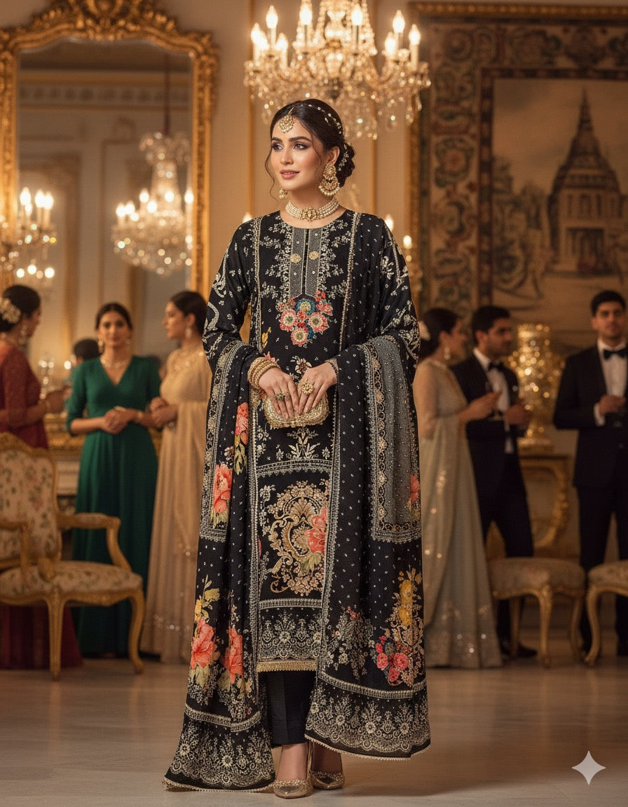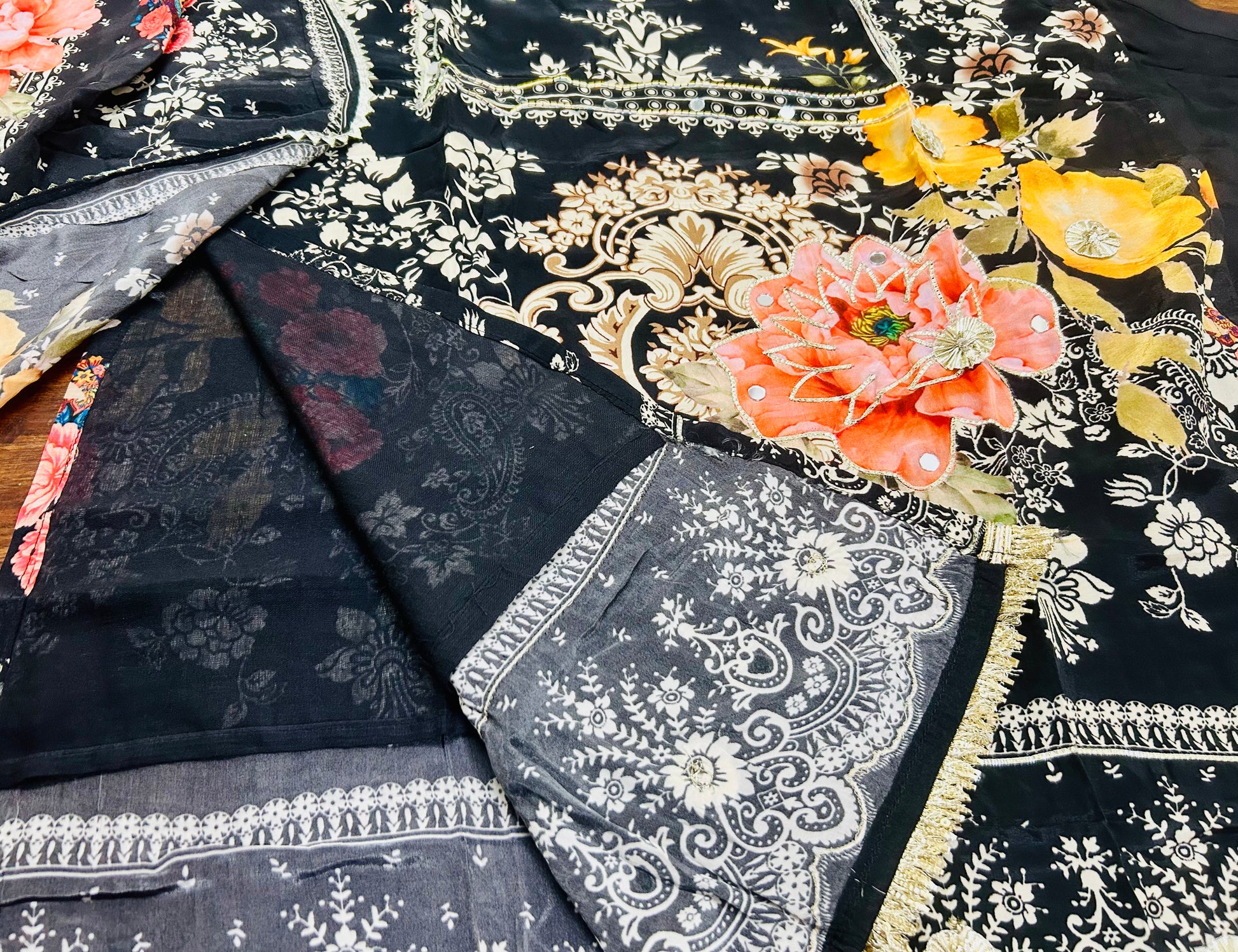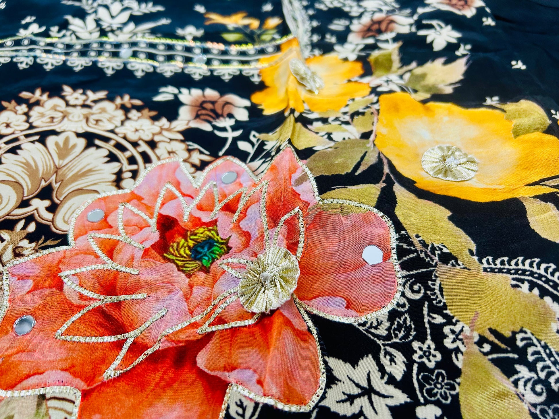 Highlights: Black color, long length suit set. Mul cotton lining in kurta. Heavy gota lace work on sleeves and hemline, gota asharfi on neck and hemline. Sequin, cutdana and mirror work makes the hemline and long neckline graceful and loaded. Beautiful floral jaal design print all over the kurta and dupatta. Front and back both sides print.