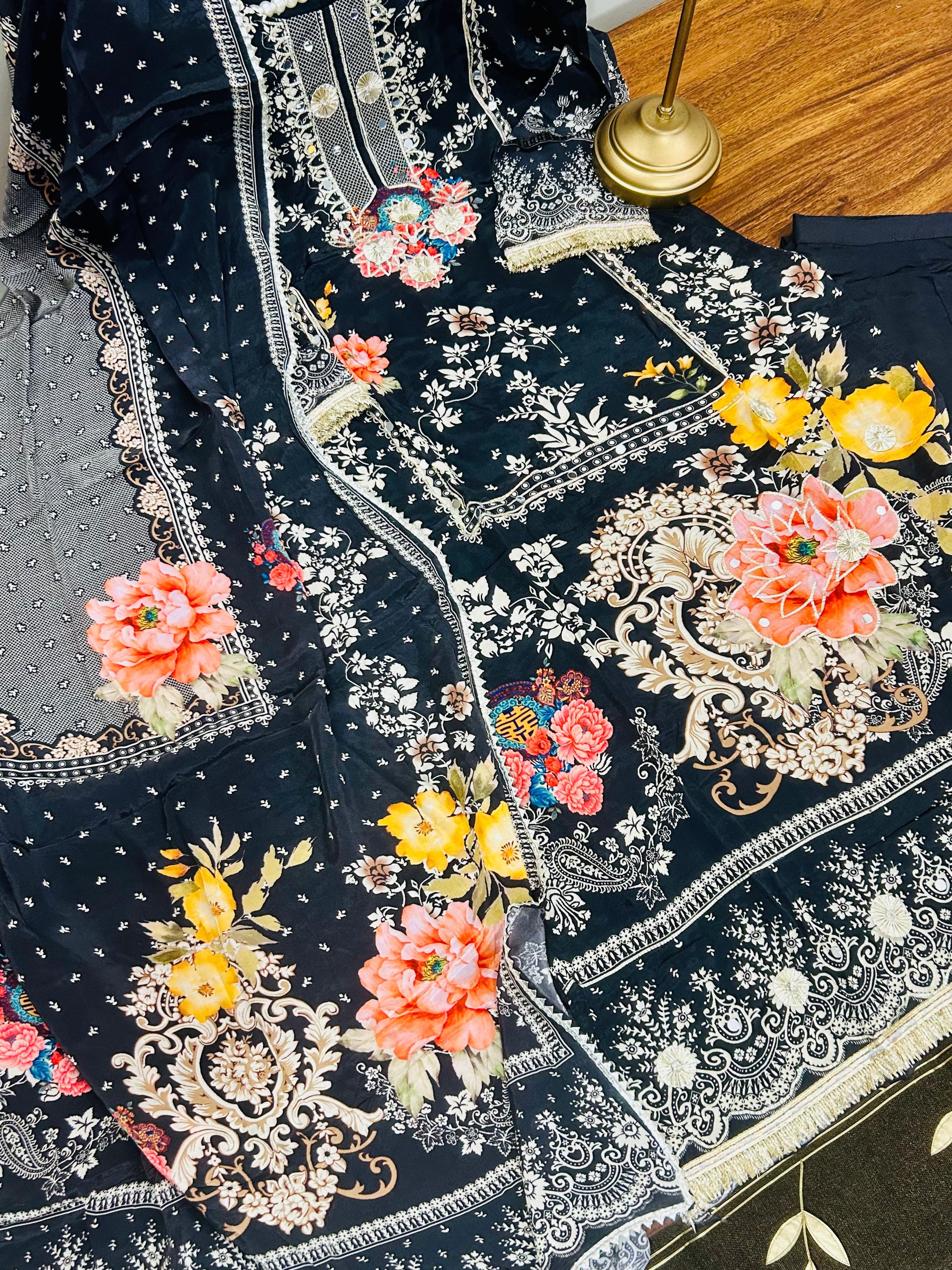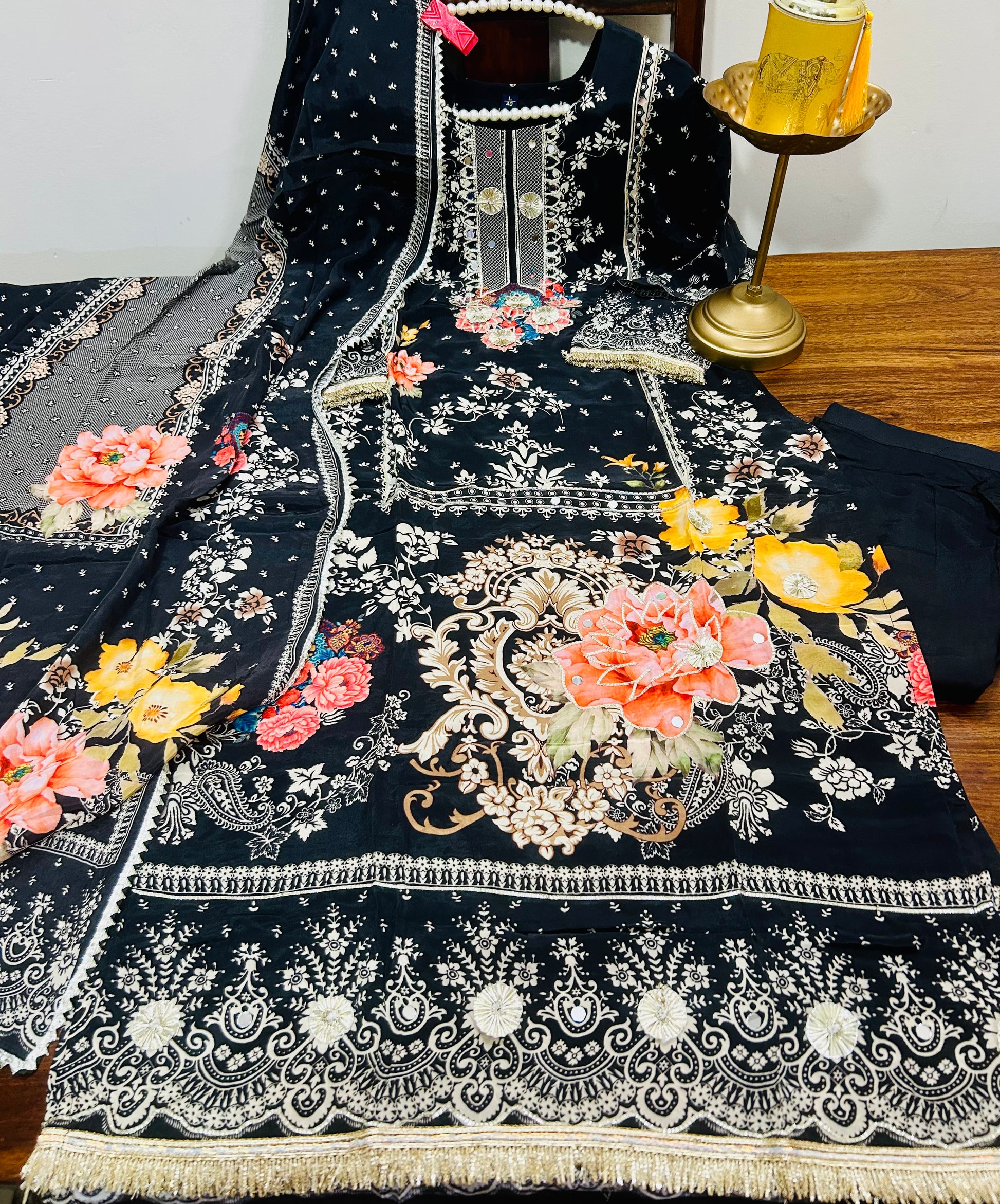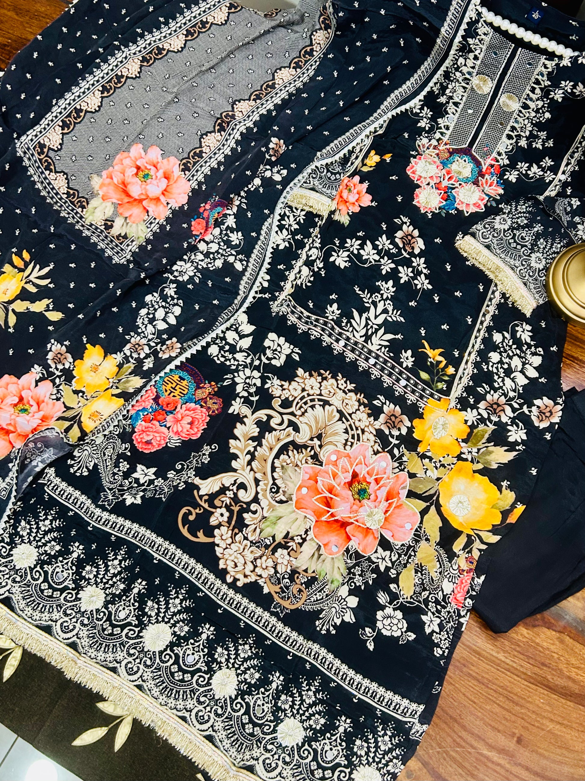 Highlights: Black color, long length suit set. Mul cotton lining in kurta. Heavy gota lace work on sleeves and hemline, gota asharfi on neck and hemline. Sequin, cutdana and mirror work makes the hemline and long neckline graceful and loaded. Beautiful floral jaal design print all over the kurta and dupatta. Front and back both sides print.