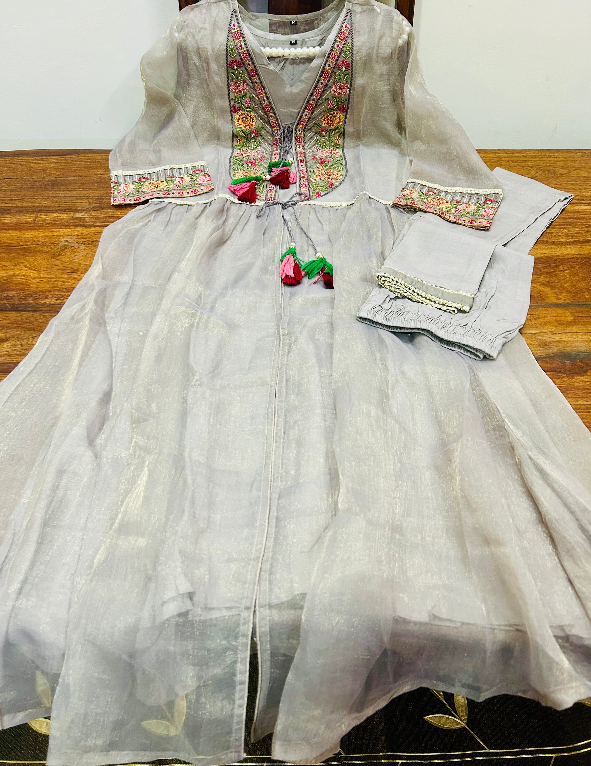 Highlights: Heavy fine detailed threadwork graceful floral embroidery and light sequin handwordk detailing on the neck and sleeves. Elegant pearl lace work detailing on the waist of jacket. Pearl lace work detailing on poncha of bottoms. Bow tied tassles included to bow tie them and style the jacket.