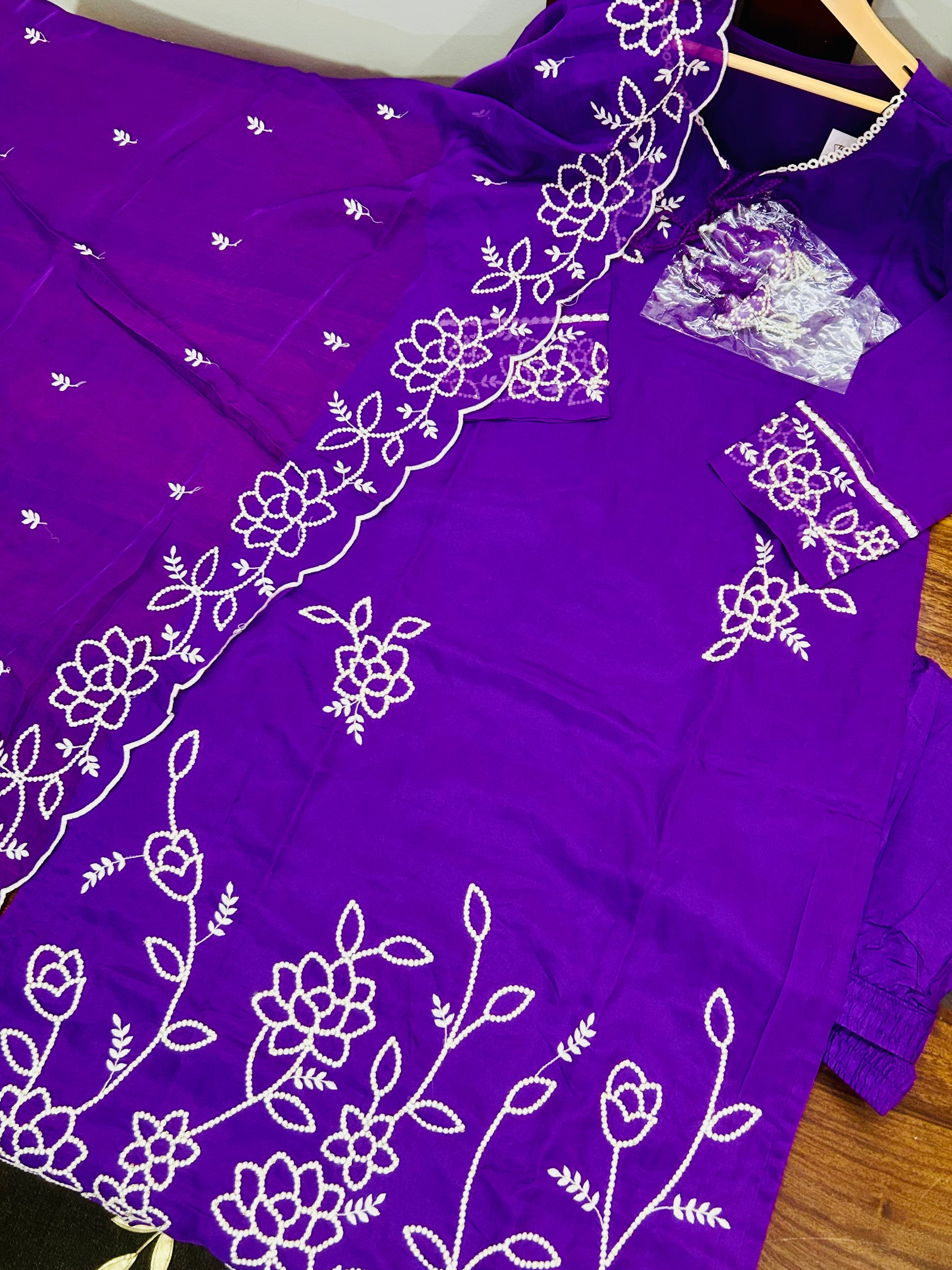 Highlights: Clean, open Floral Vine Embroidery. The stylized flowers and leaves are primarily outlined, giving the work a modern, airy look. Coordinated floral clusters and embroidered cuffs complete the look. A full-length, embroidered border on the dupatta mirrors the vine pattern of the kurta, tying the entire look together.