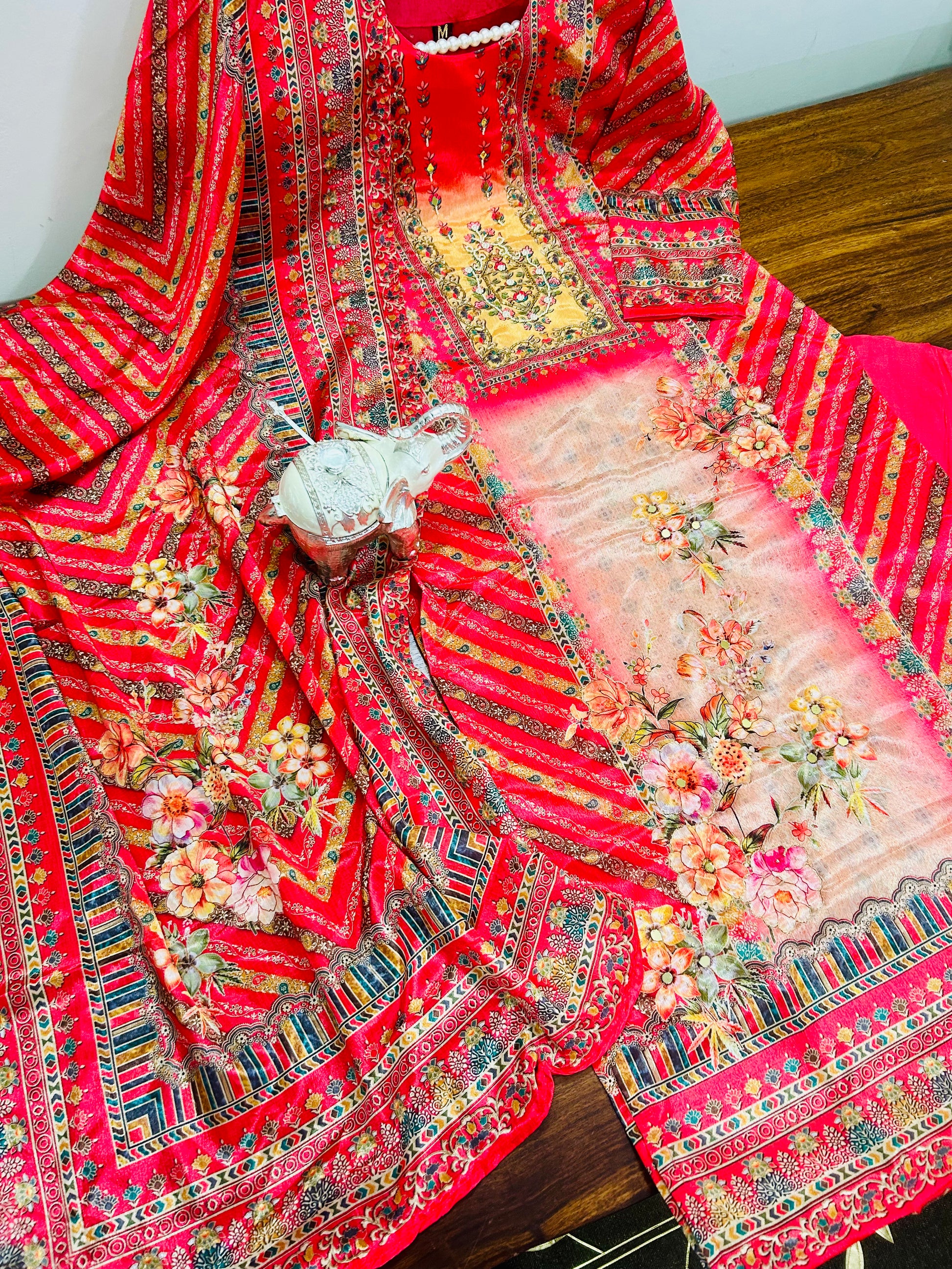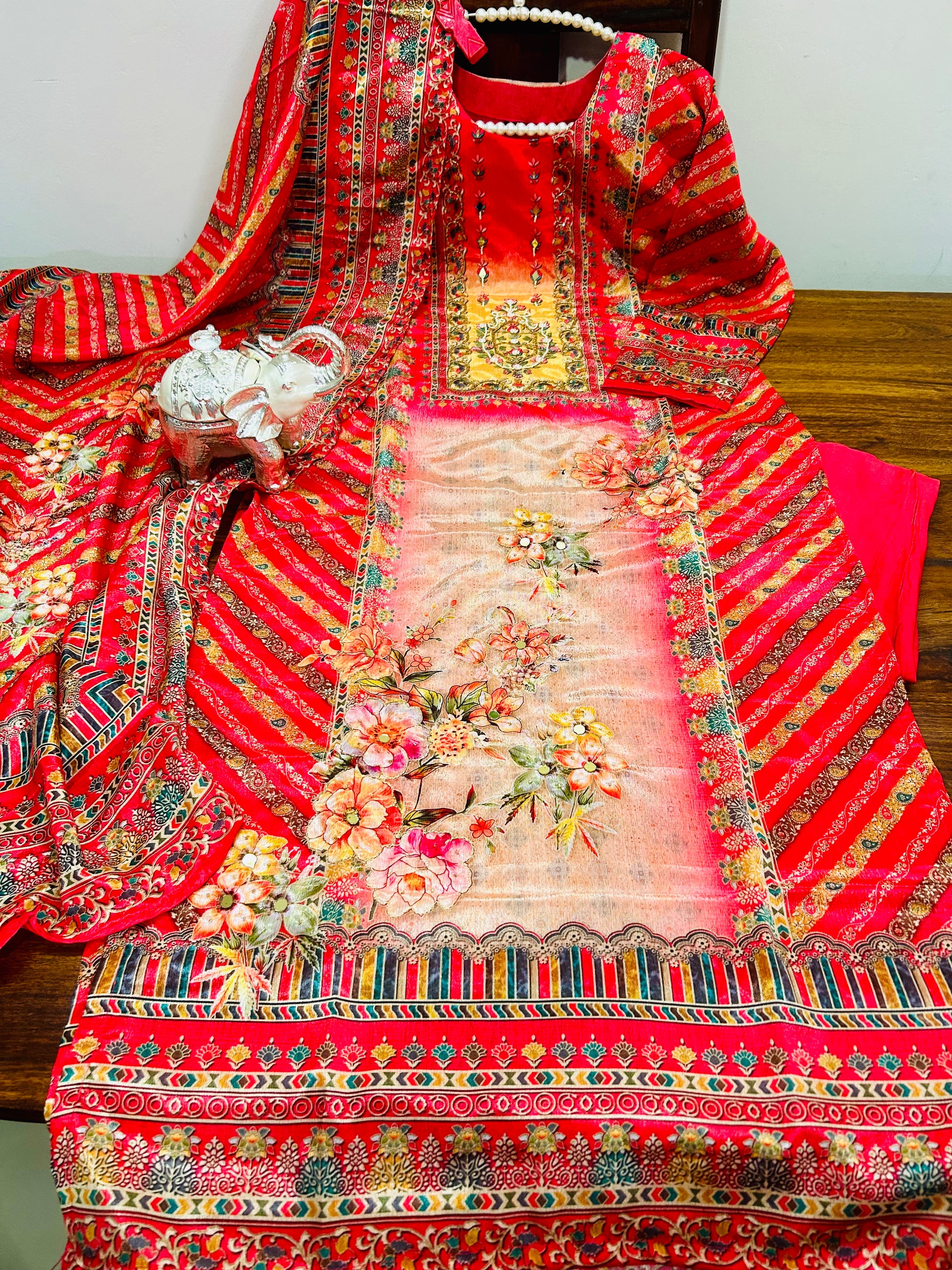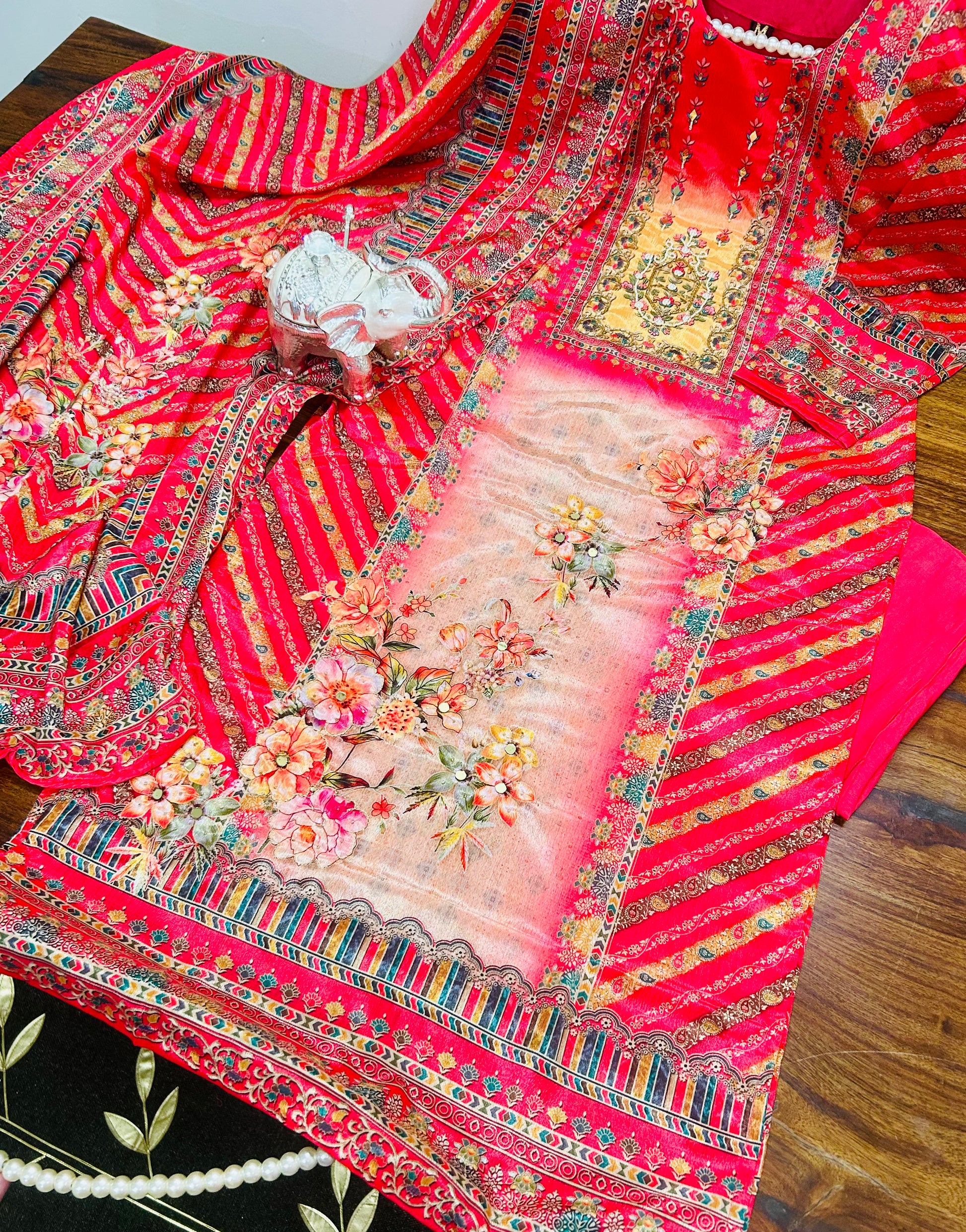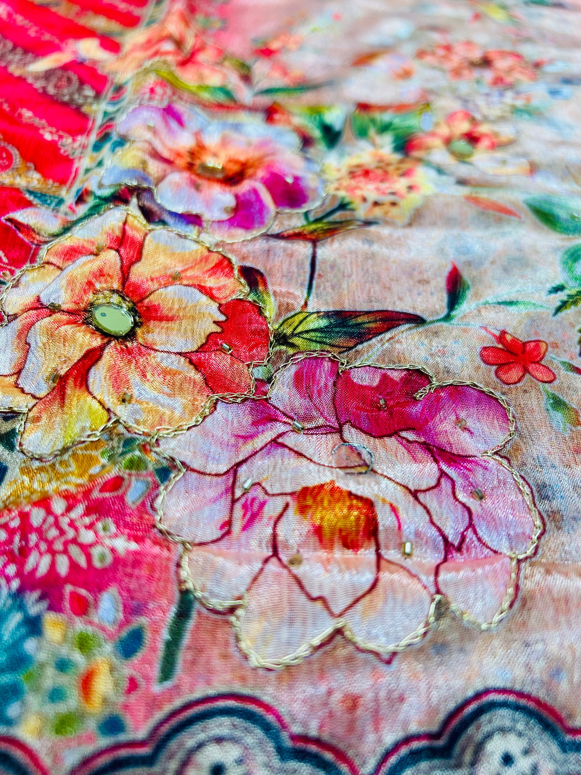 Highlights: Intricate floral digital print on the kurta and dupatta. Cutdana, original mirror, and resham zari thread work on the kurta's neck and hemline. Cotton lining inside. Plain plants. (The model image is AI generated, please refer to the rest of the images with hanger in flat lay)